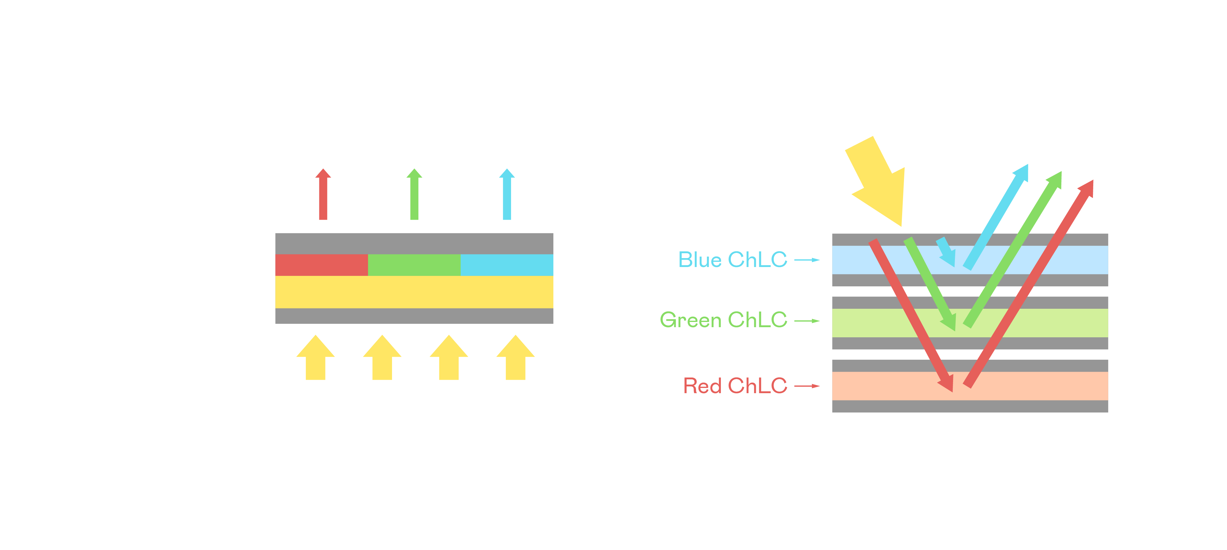 AB娱乐胆固醇液晶显示器是由红、绿、蓝三层胆固醇液晶面板堆叠而成,并采用无彩色滤光片设计,减少环境光在反射过程中的损耗。